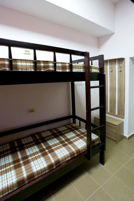 Кровать в общем номере с отдельным входом, микроволновой печью и кухонными принадлежностями.